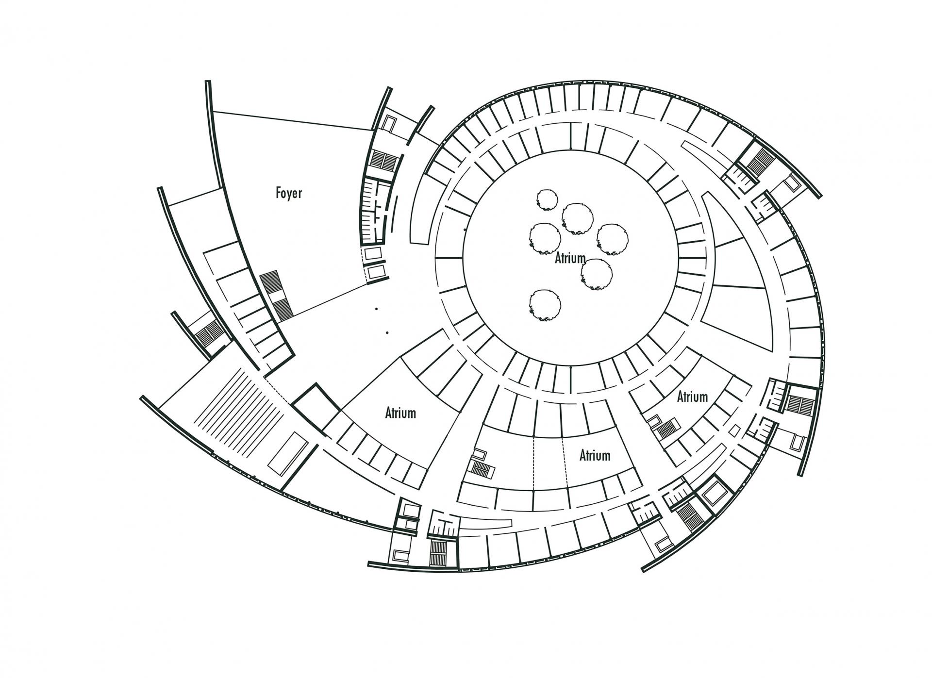 Die Form des Gebäudes, das durch Vorbilder aus der Natur inspiriert ist, basiert auf der Geometrie des zentralen Rundkinos, dem innovativen, energiesparenden Lüftungssystem, das natürliches Strömungsverhalten ausnutzt, und auf Strategien zum Management der Besucherströme.