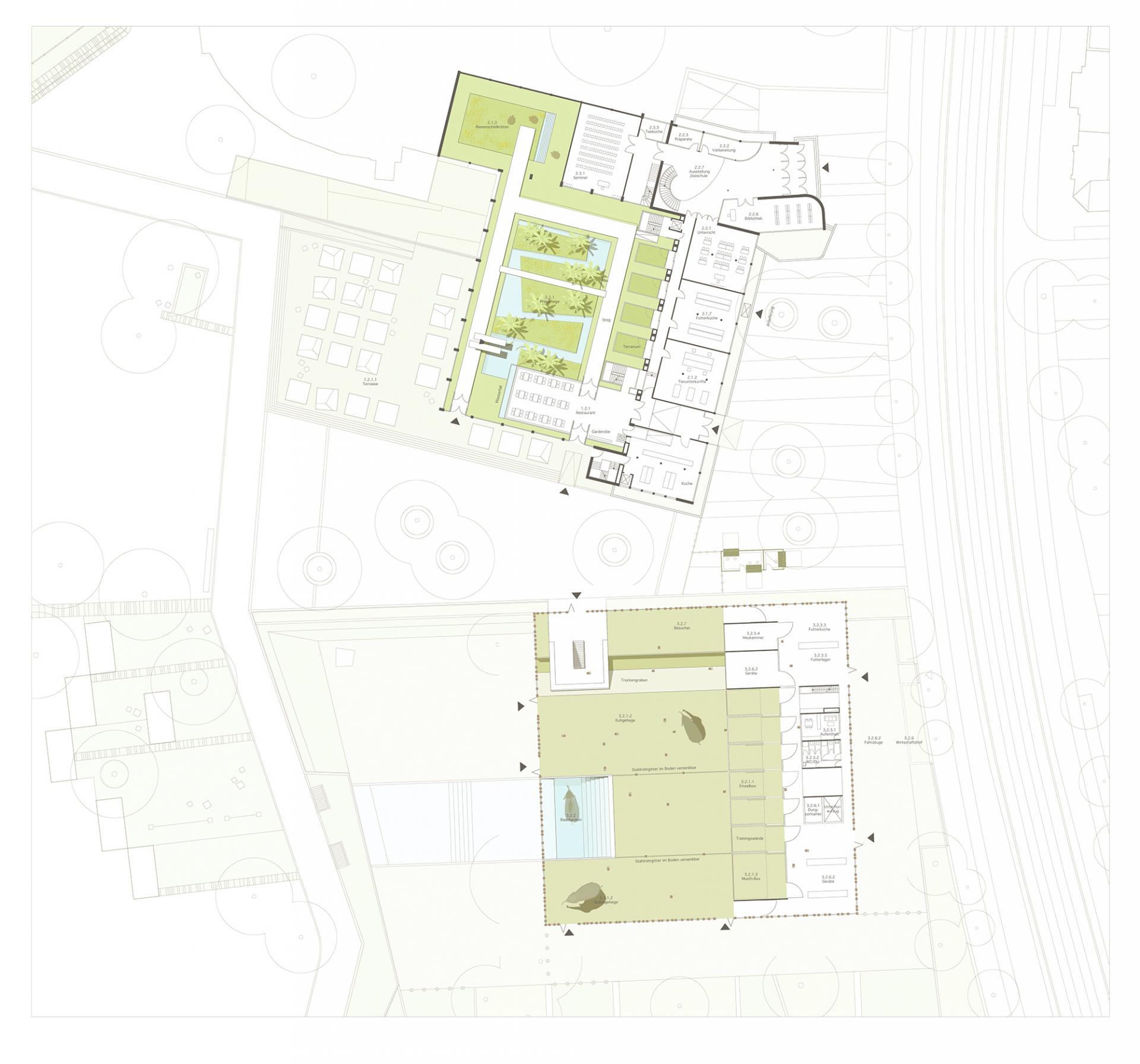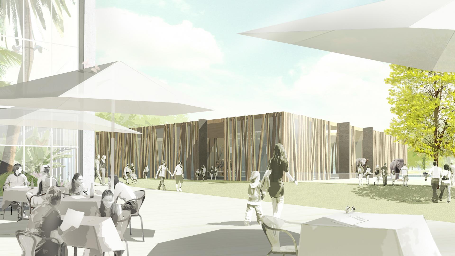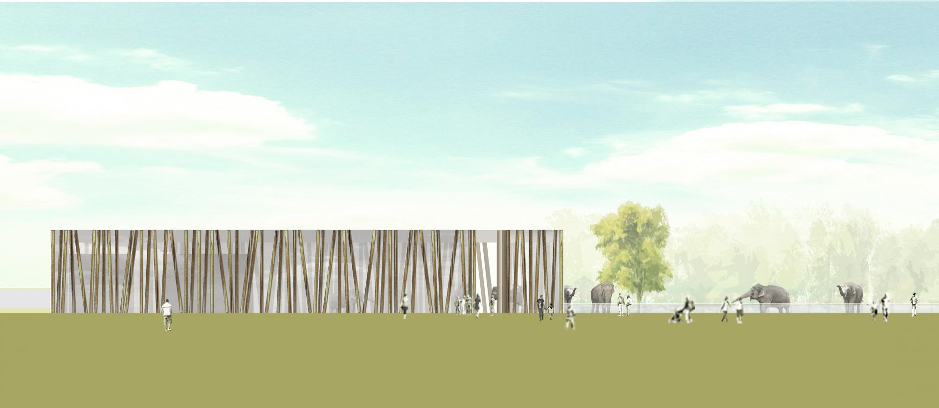 Der Entwurf des Elefantenhauses ist in seiner Bedeutung und Form von dem natürlichen Lebensraum der im Karlsruher Zoo gehaltenen asiatischen Elefanten, dem Urwald mit dichtem Baumbestand und einem Dach aus Baumkronen, geprägt.