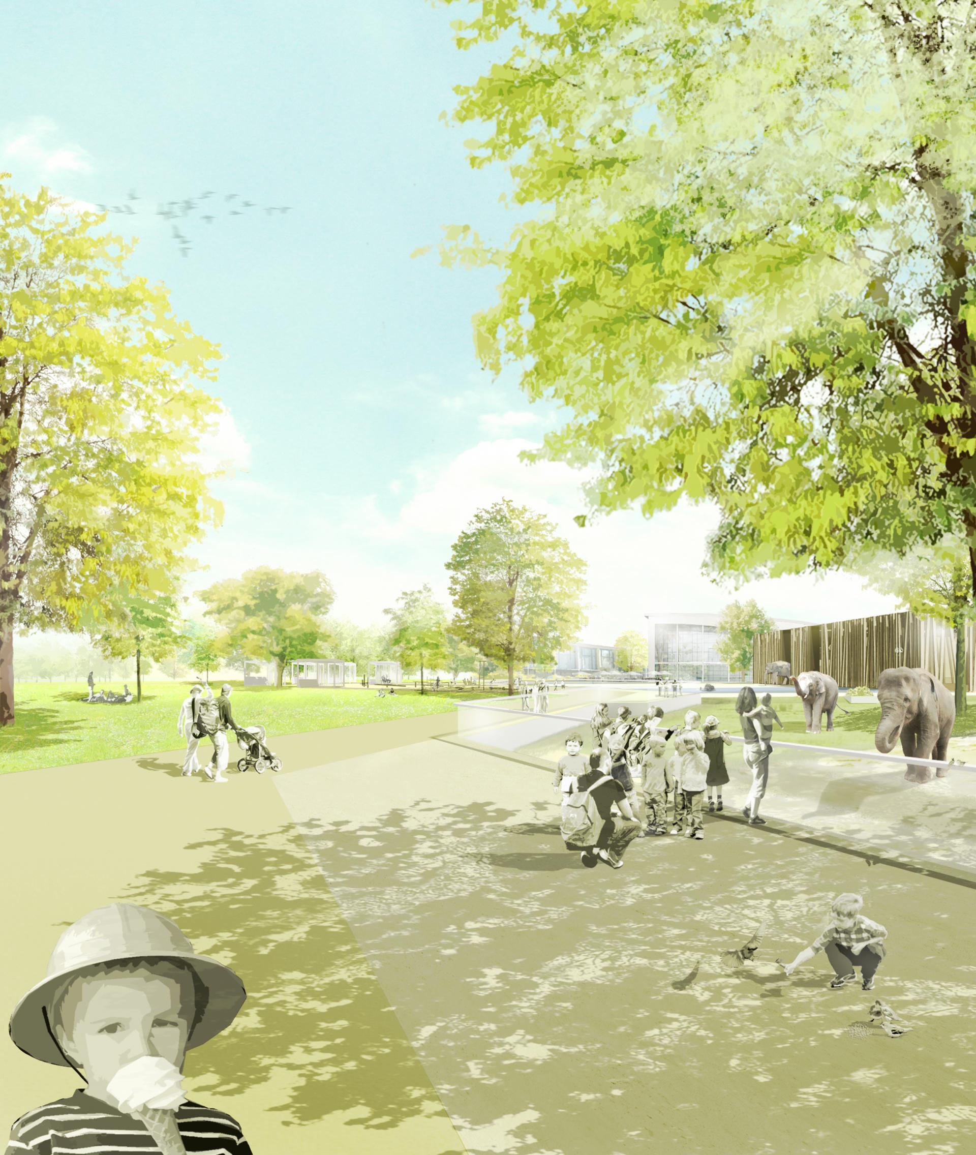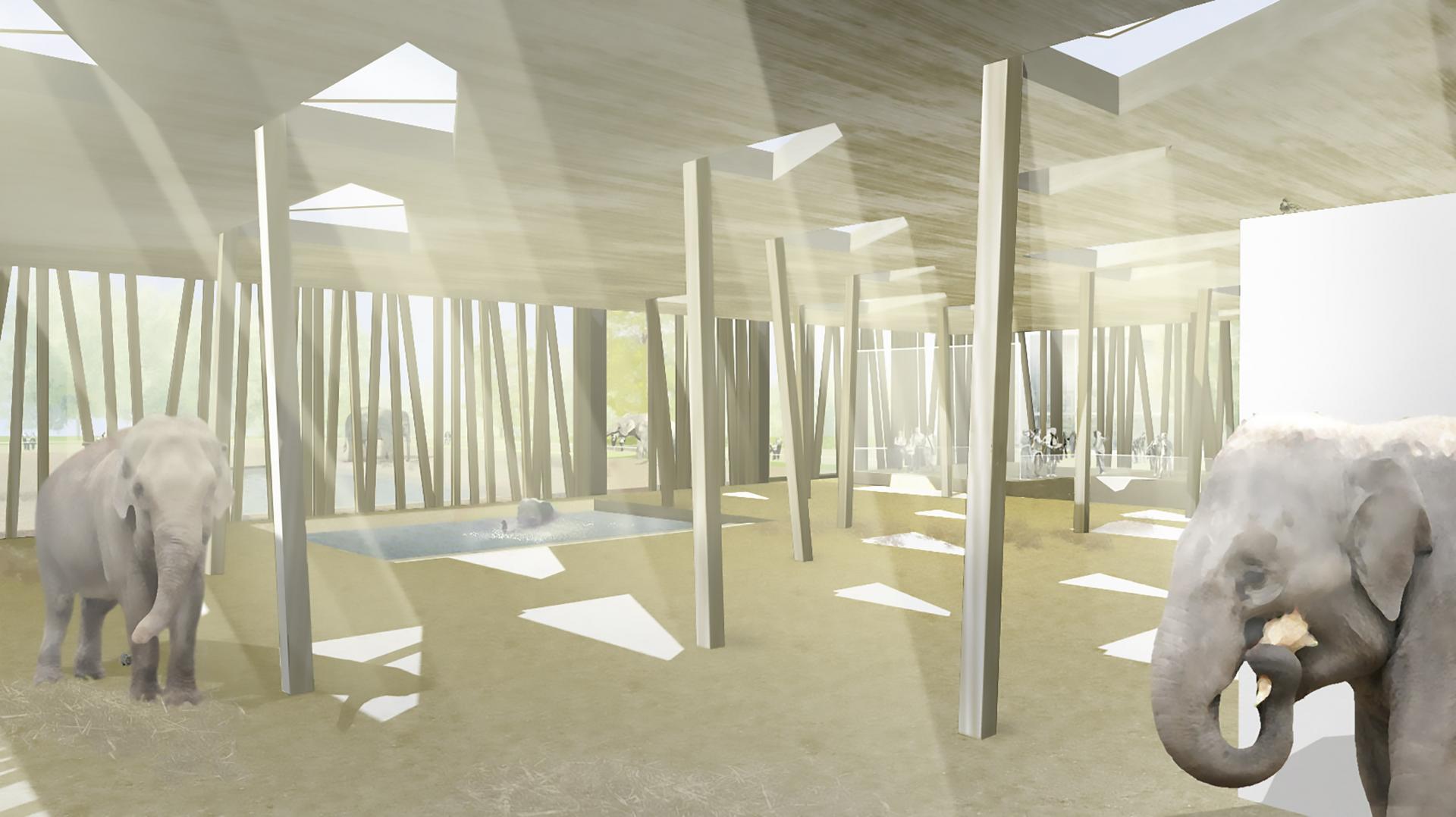 Er greift das Bild des Dschungels in abstrahierter Form architektonisch auf, Baumstämme werden zu tragenden Stützen, das geschlossene Dach wird durch Lichtungen in Form verglaster Oberlichter durchbrochen, die baulichen Elemente bilden eine Komposition subtiler Unregelmäßigkeit innerhalb eines Systems. Das Elefantenhaus ist Teil des Gesamtgeheges, dessen Gestaltung – einschließlich Wasserbecken – innen und außen durchgängig ist.