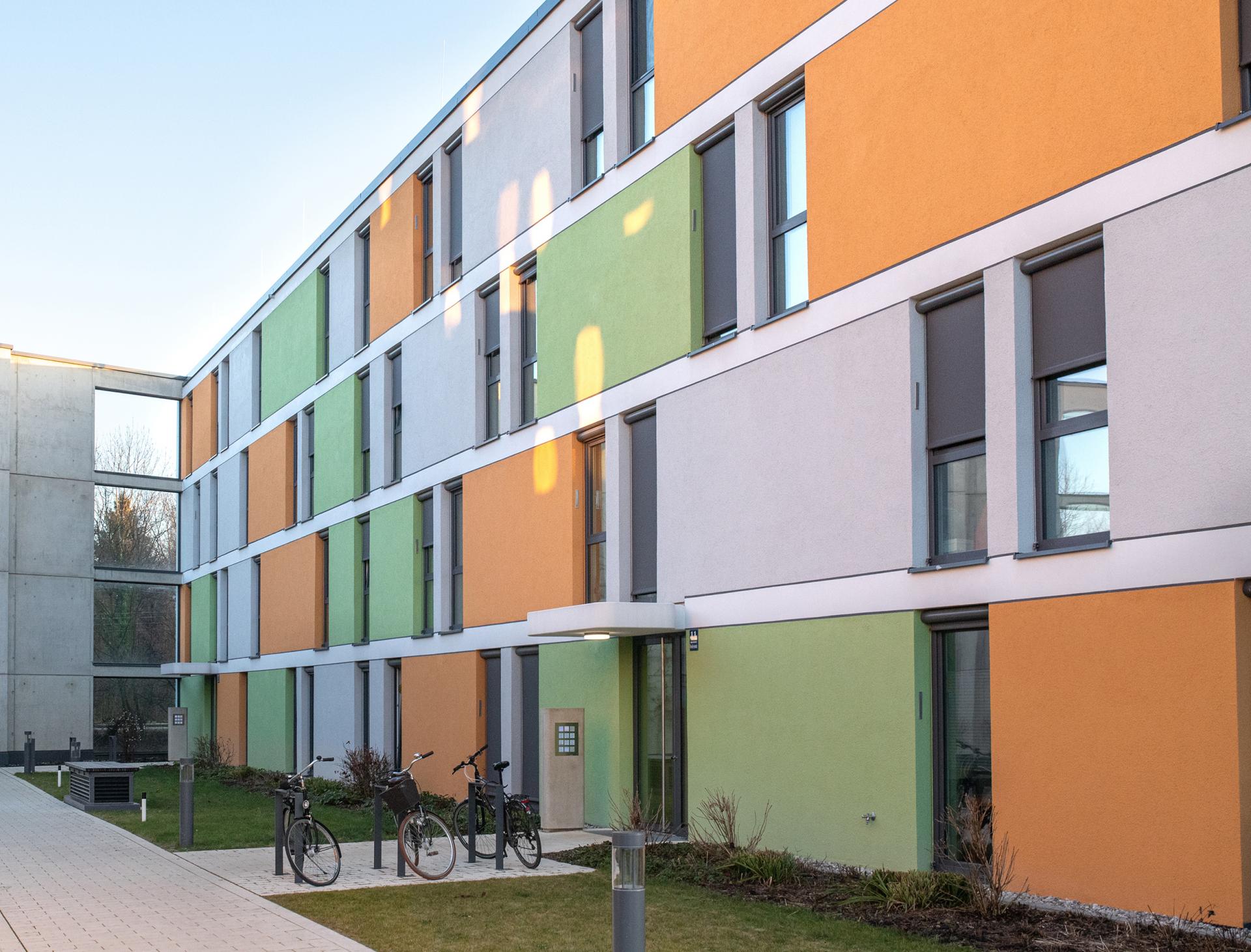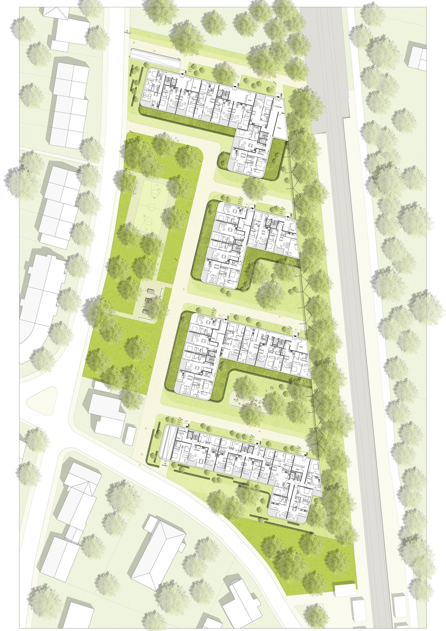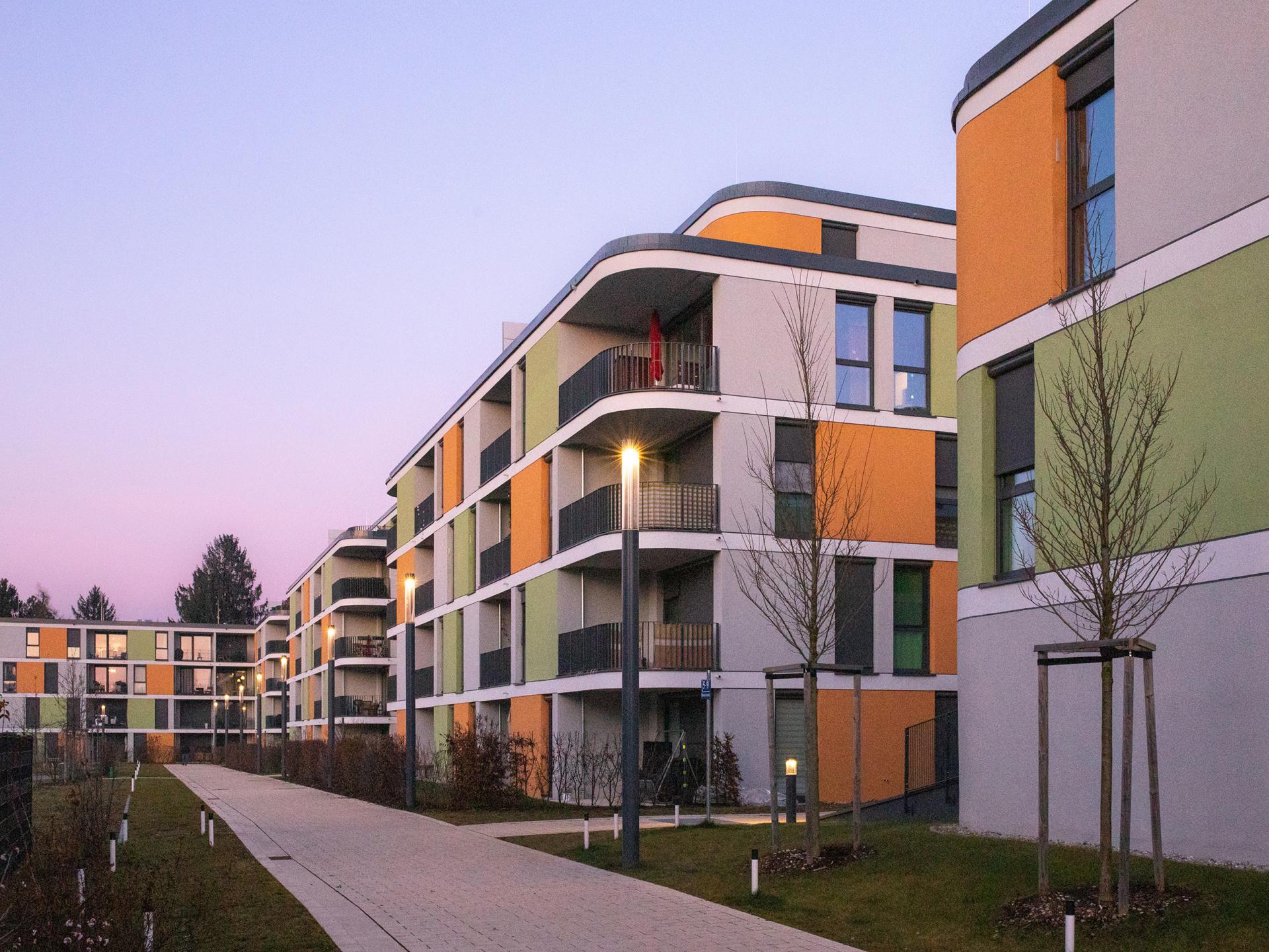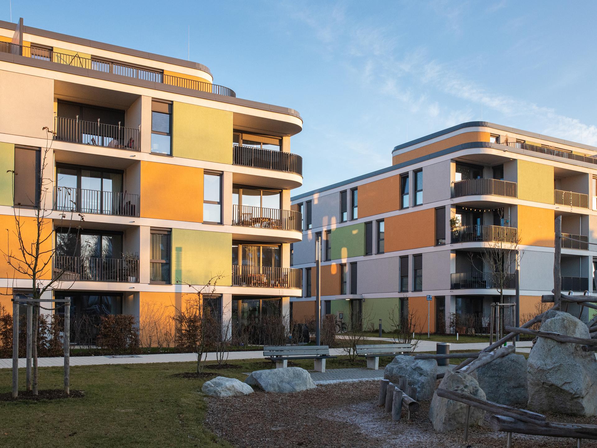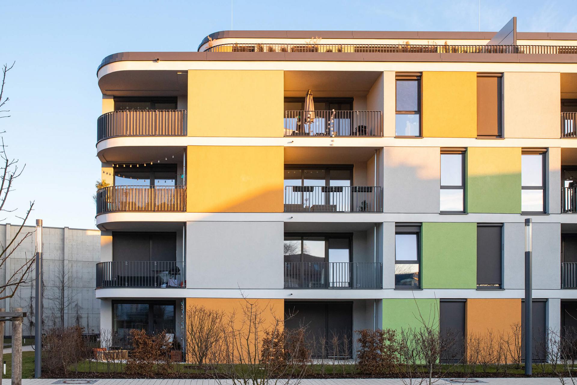 Die Fassaden der vier Häuser zeigen ein freies Spiel von offenen und geschlossenen Flächen in unterschiedlicher Farbigkeit. Sie wirken – auch durch die runden Gebäudeecken – leicht und spielerisch und verleihen dem Gebäude-Ensemble ein identitäts-bildendes, charismatisches Gesicht. Der parkähnliche Freiraum um die neuen Wohngebäude sieht einen dichten Baumbestand vor, der ihn zur S-Bahnstrecke hin abschirmt und – zusammen mit der Schallschutzwand, die abweichend von unserer Planung nicht gläsern ausgeführt wurde – den Lärm der Stadt auf ein Minimum reduziert.