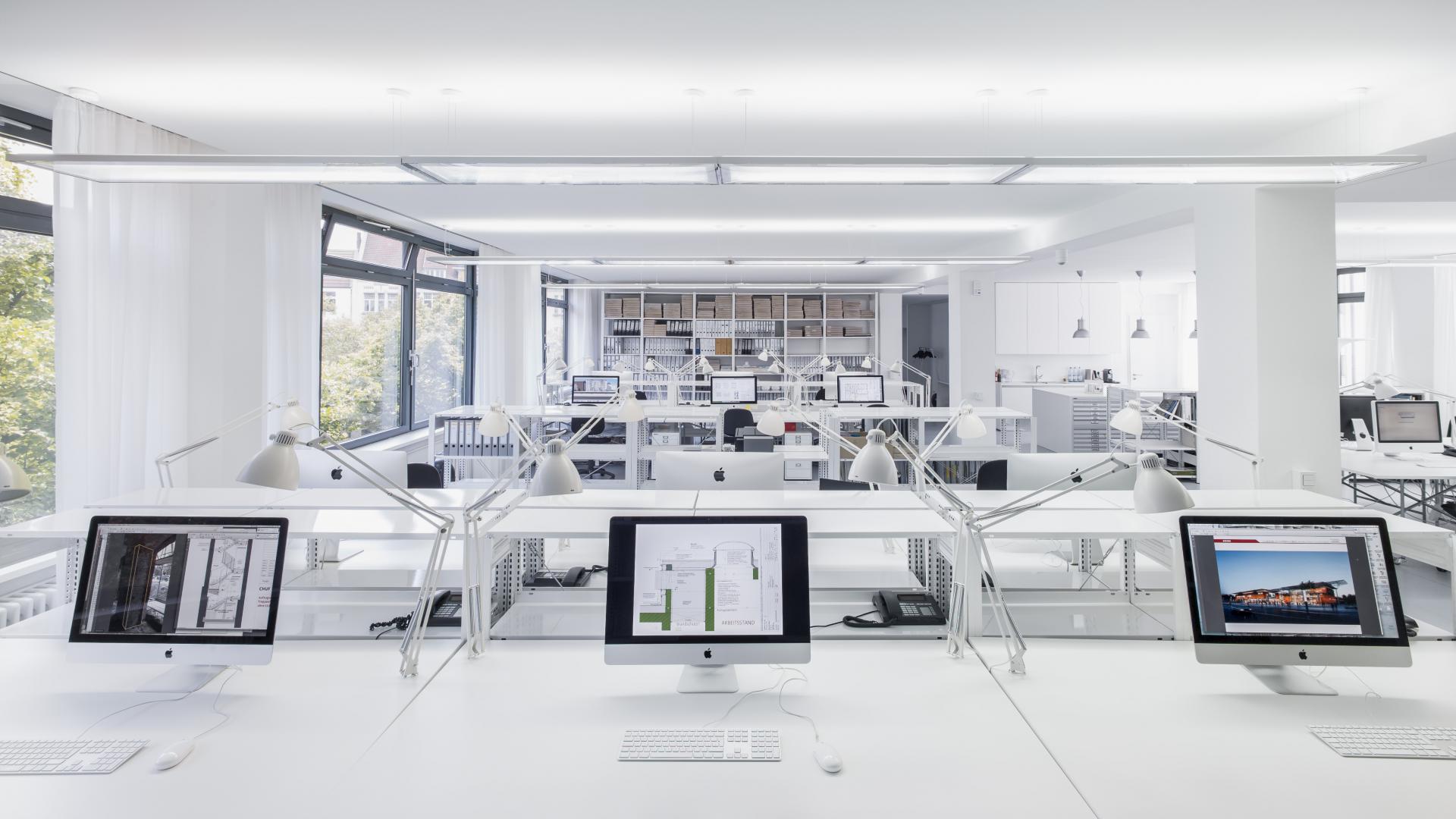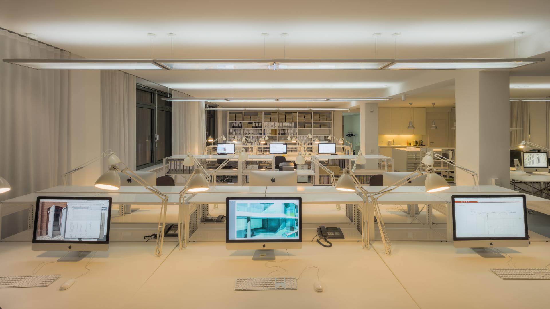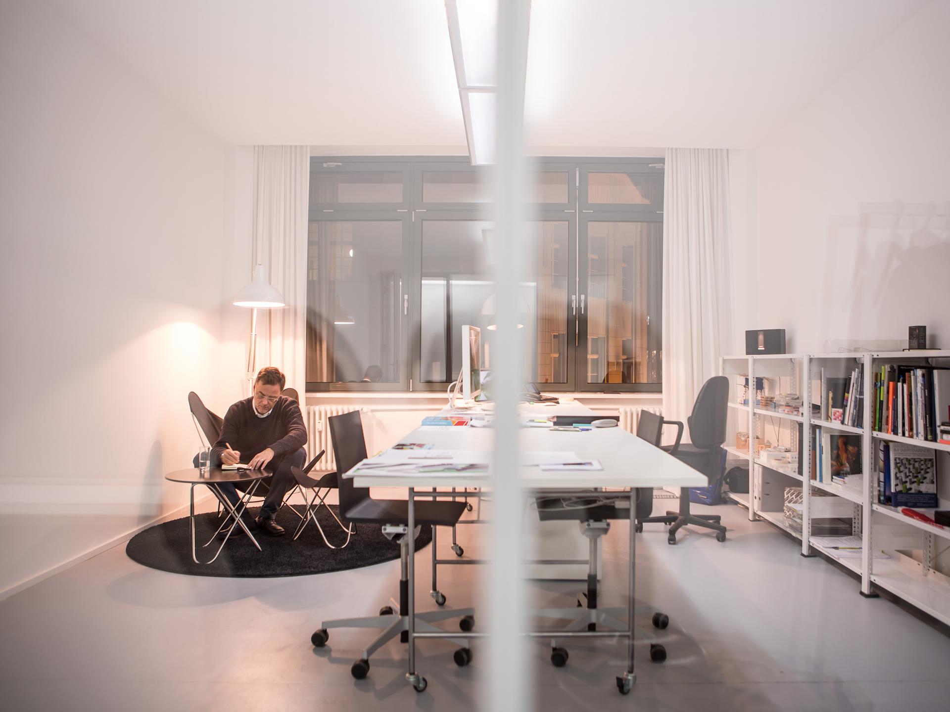 Based on constantly evolving research, we recognize the importance of the right quality of light for our health, well-being and productivity. For a well thought-out, contemporary interior, we need a well designed, innovative lighting concept in our own spaces that takes the latest psychological and physiological findings into account. Together with the doctor and chronobiologist Dr. Dieter Kunz, a leading researcher for sleep- and chronomedicine in Berlin and the designers of "LICHT KUNST LICHT“, Collignon developed a lighting concept that changes dynamically throughout the day on the basis of the circadian rhythm and thus adapts to biological needs. "Such lighting systems actively contribute to maintaining and increasing the health, well-being and performance of employees," says Dr. Dieter Kunz. Only about 15 years ago, it was discovered that there is a photoreceptor on the retina, which tells our internal clock the information "day" or "night" and the length of the day. This receptor is essentially responsive to blue light. "This means that we strengthen our health when we use dynamic light, with a high percentage of blue during the day and a warmer light color towards the night," explains the physician. In the evening, this creates a warm, intimate space of light at the workplace. The lighting mood in our office appeals to the archaic, millennia-old human programming: During the day it resembles being under the open sky and we feel fresh and energetic; In the evening, we have a similar feeling as if we were sitting around a fire in our shelter.