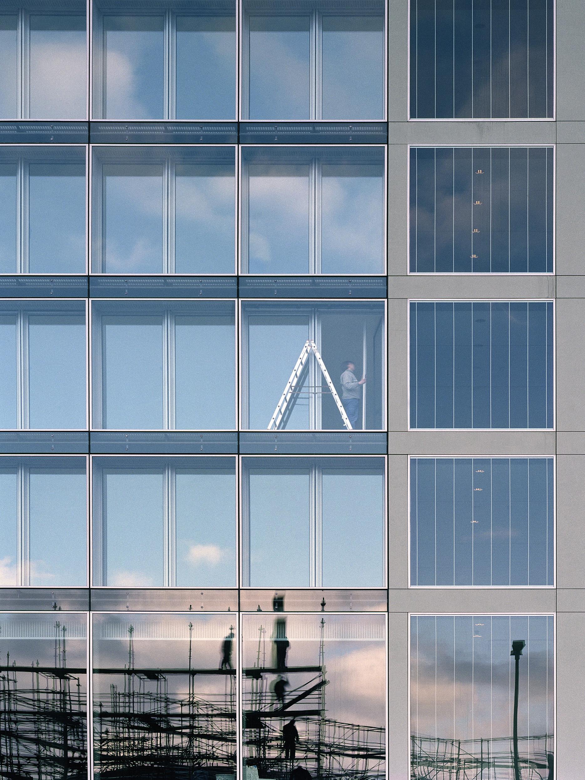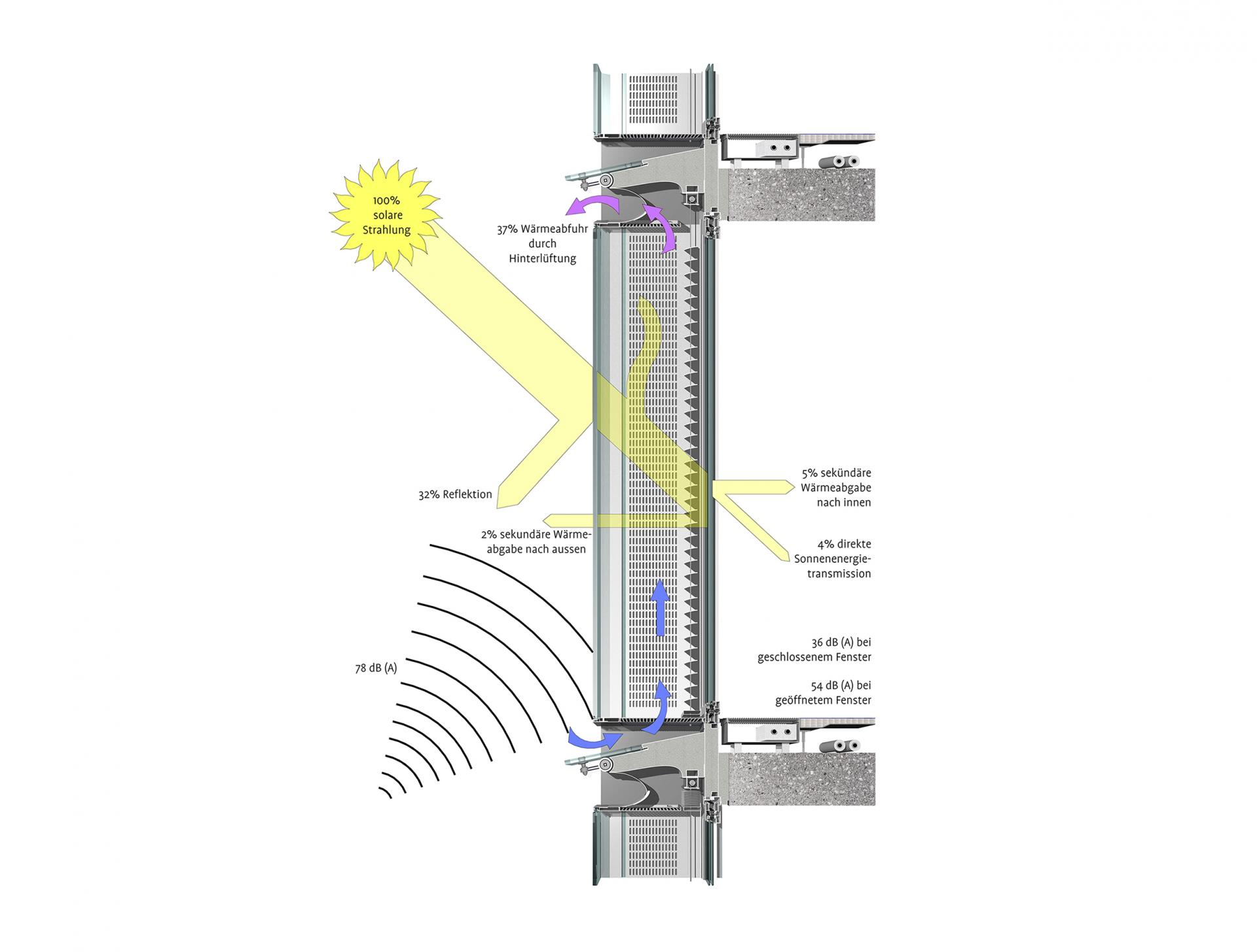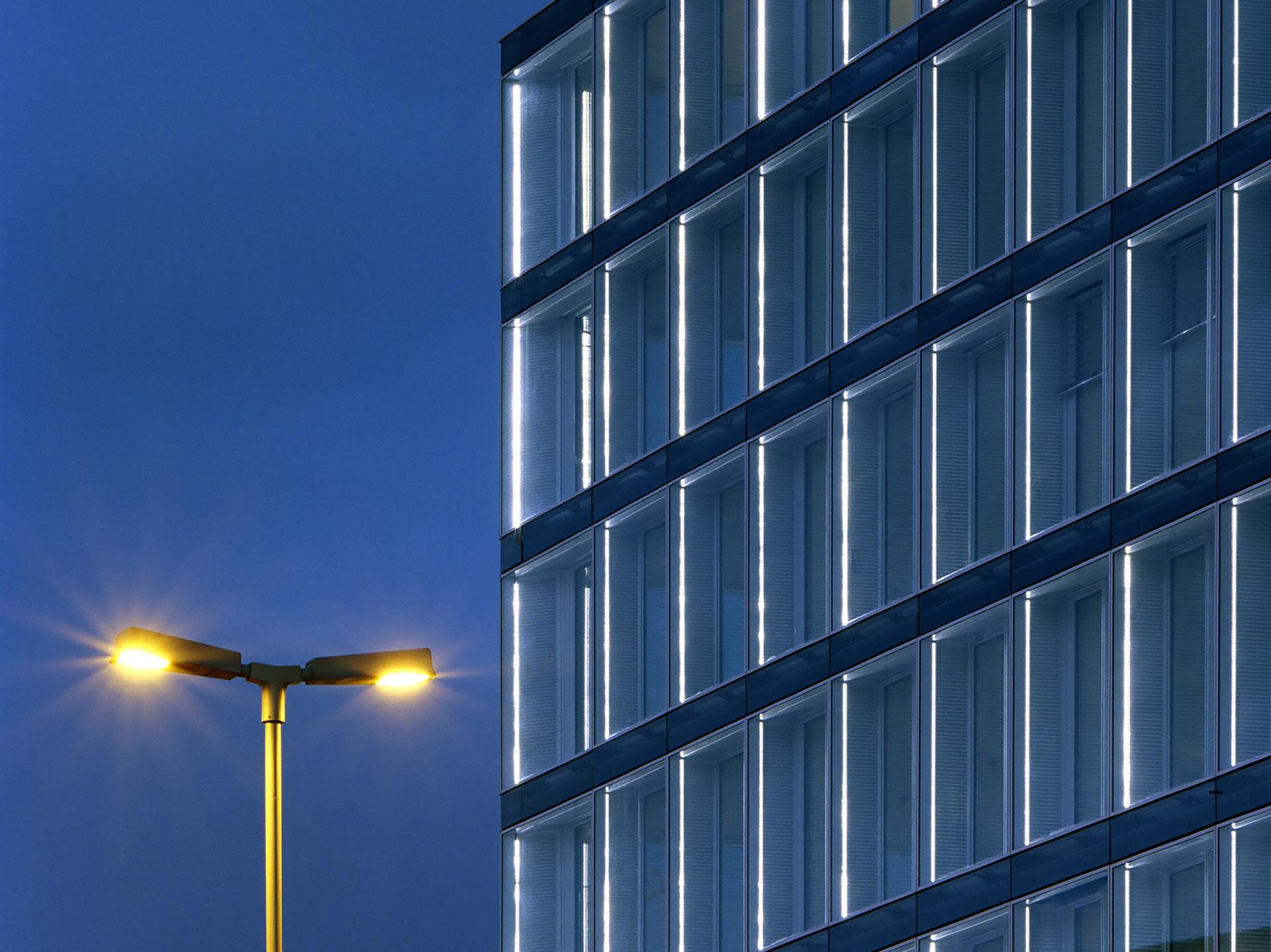It consists of the "cell façade", newly designed by CollignonArchitektur. Its solutions, in terms of technical construction, building physics and architecture, are an innovative development of the double façade. This façade is part of the overall ecological concept of the building. It saves energy and improves thermal comfort in winter. It also provides sound insulation with natural window ventilation at this highly congested intersection. The sustainable concept allowed the authorities to approve a very high land usage density for this compact office and commercial building. An integral part of the architecture is the lighting design of the façade.