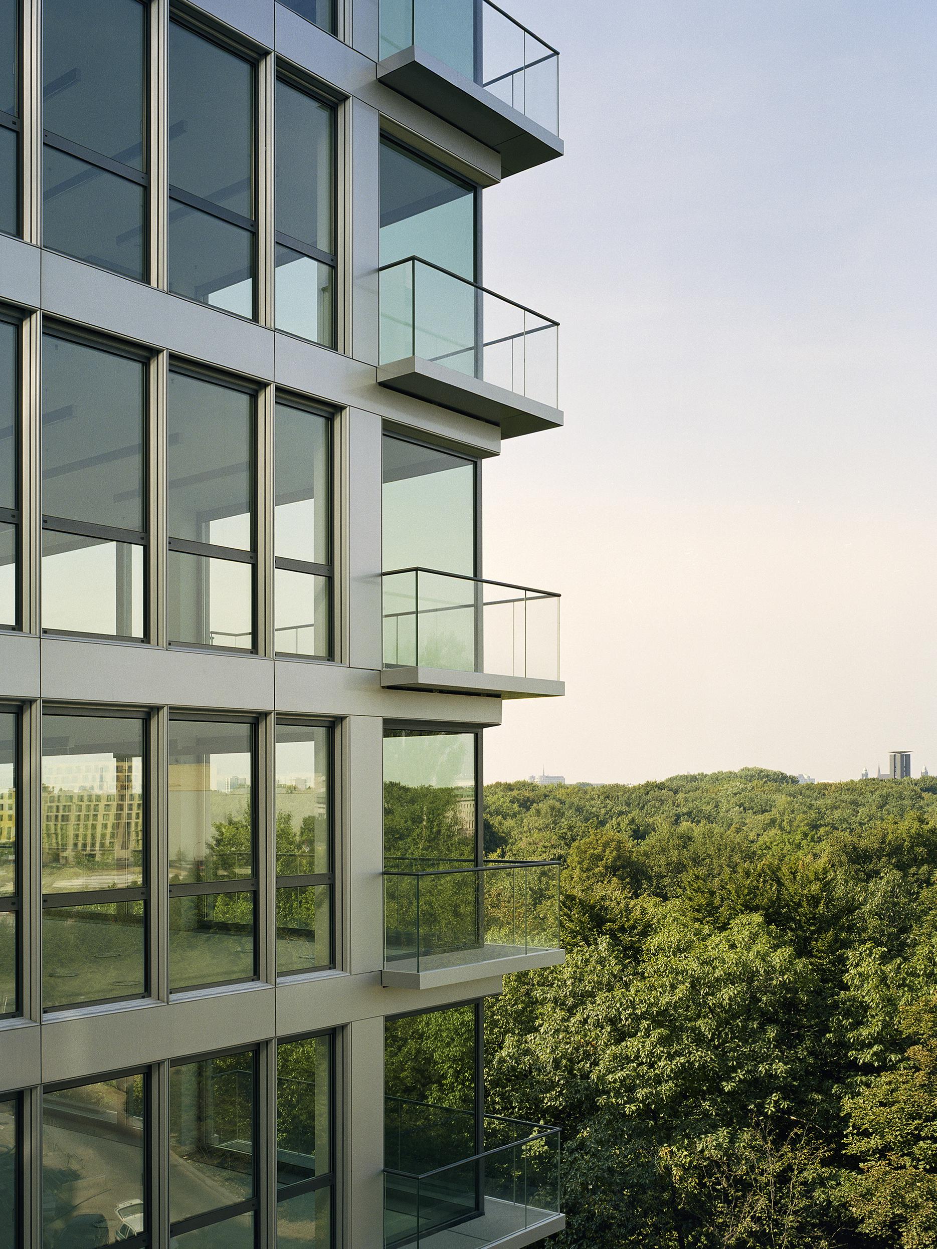The ten-story house at Lennéstraße 5 has a clearly legible supporting structure, the glazed north facade opens up to a “window to the park”.