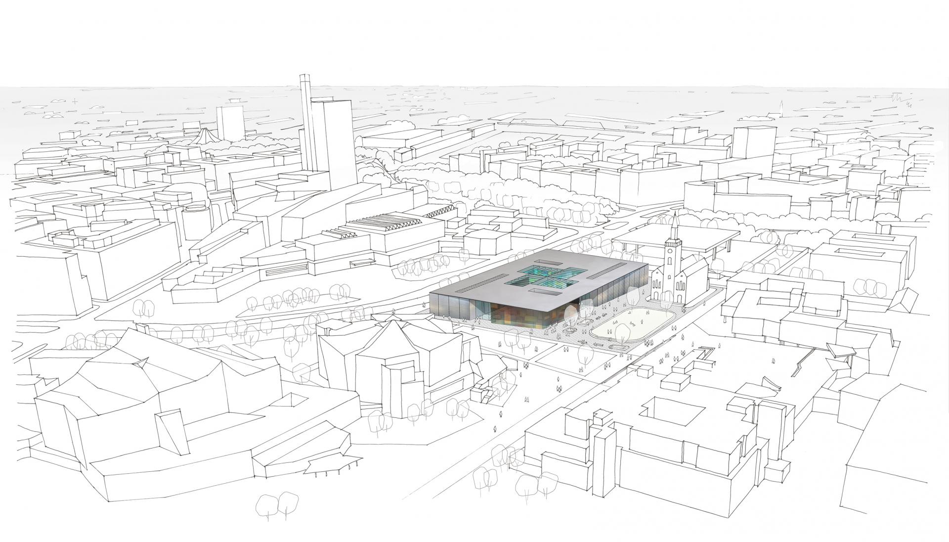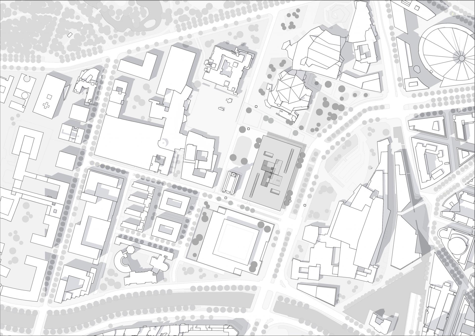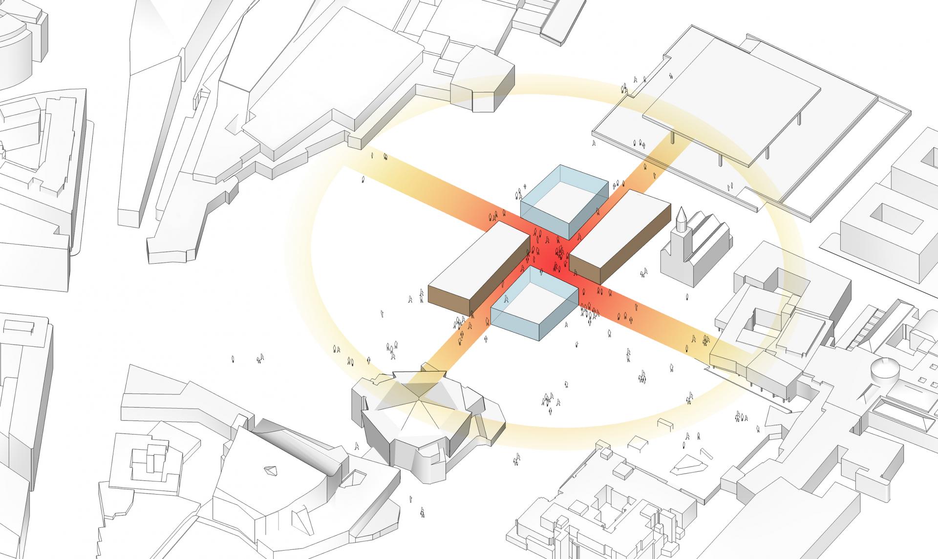 The large gap in the urban ensemble becomes a lively, stimulating place that links the adjoining spaces.