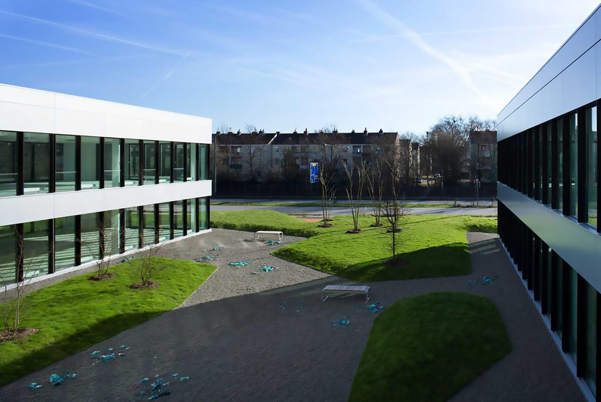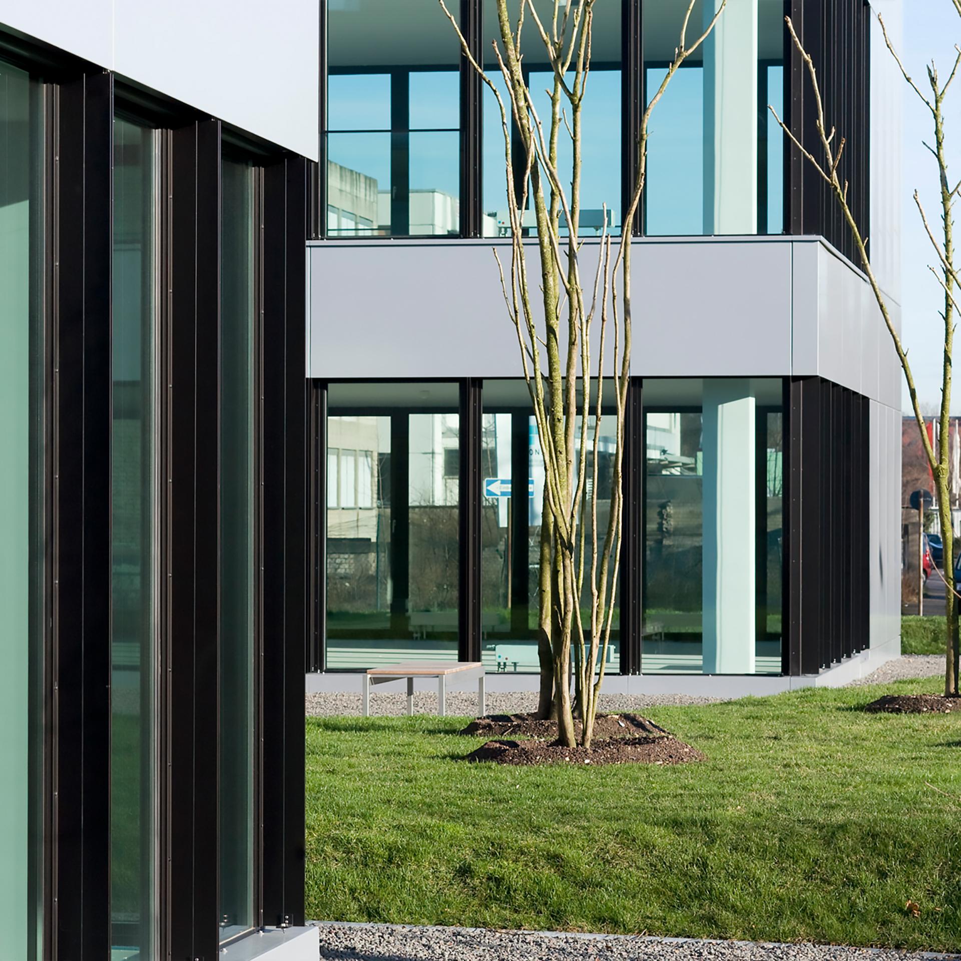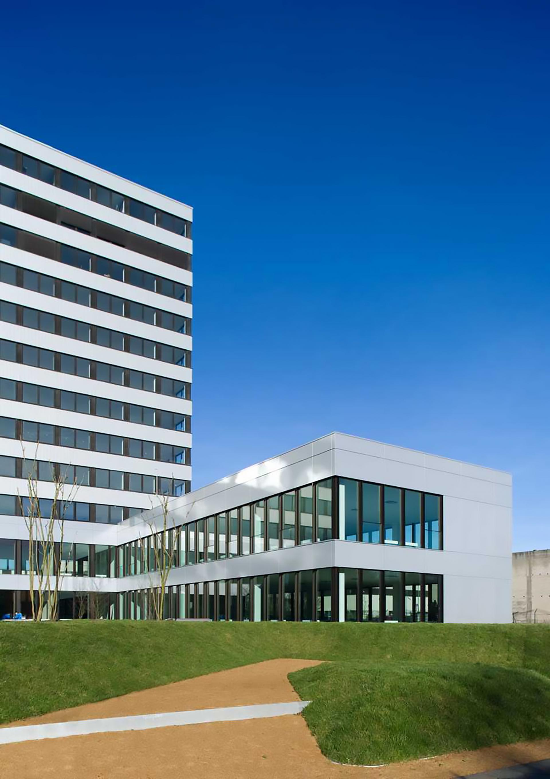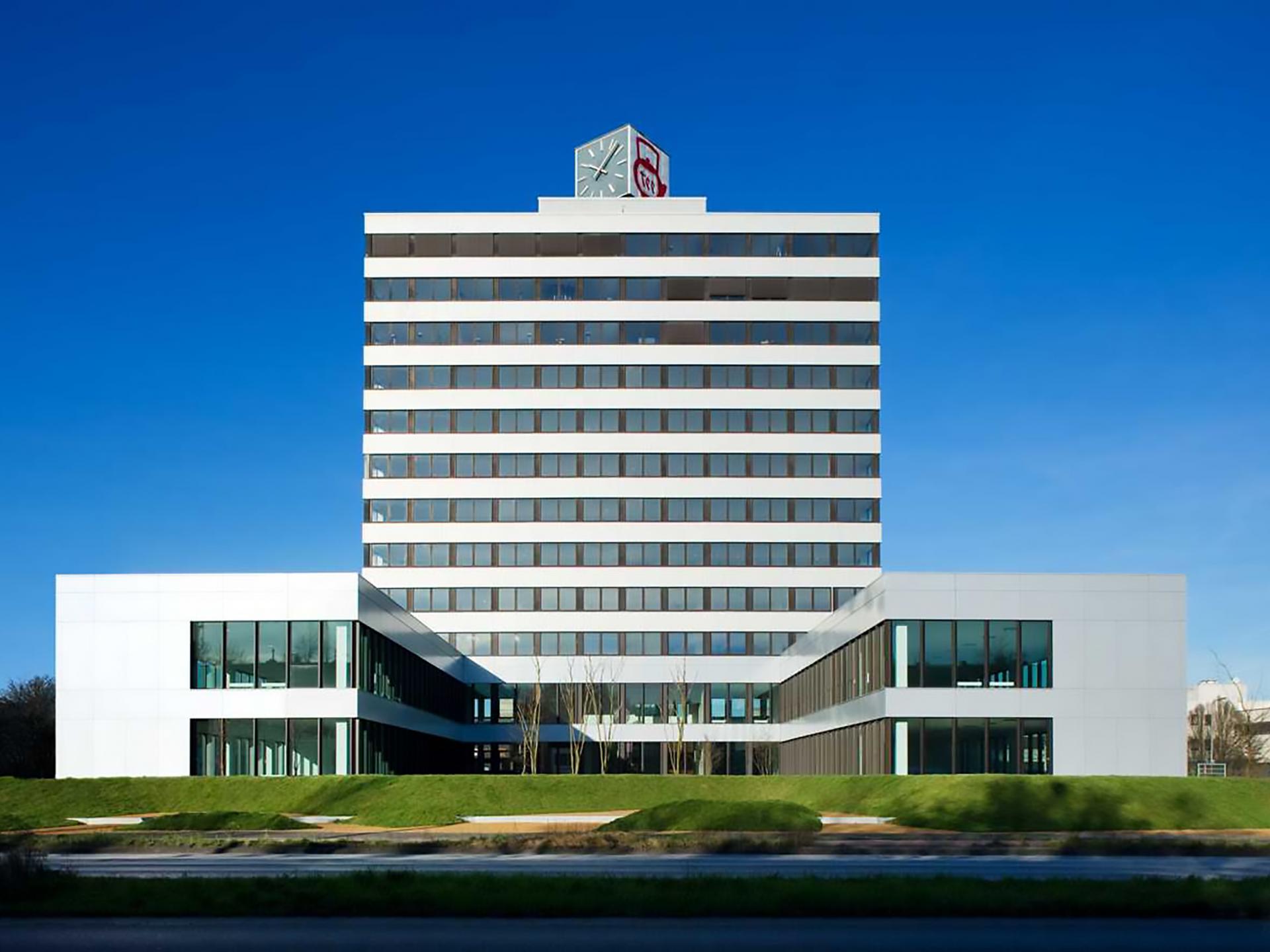 By partially demolishing the unattractive extension to this Seventies high rise building, we created a new, representative entrance situation. The building is now orientated on the city and on the adjoining main traffic road. The building's new "story" and name become experienceable by specific design elements representing them. Both fit with the new marketing communication strategy.