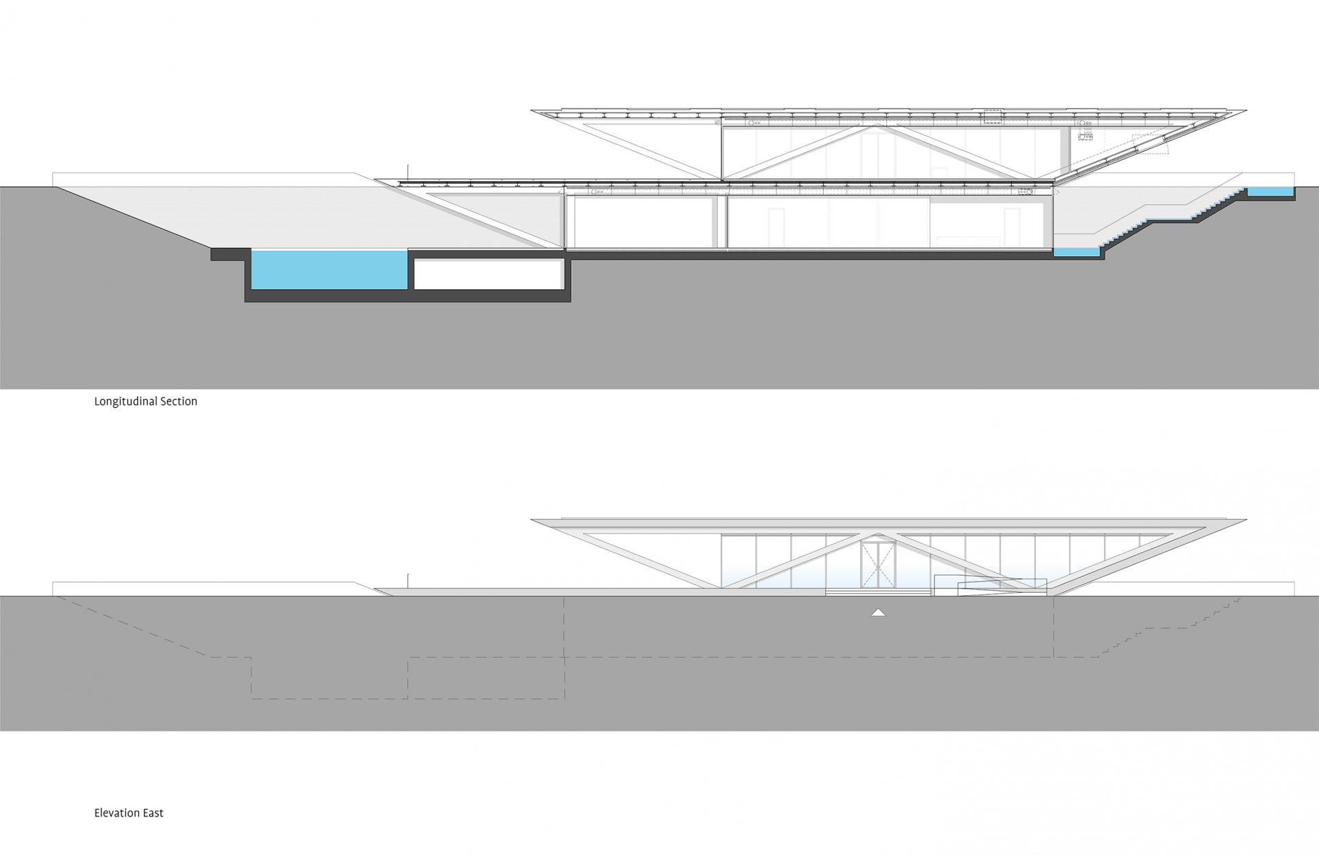 The dynamic architectural form is inspired by the movement of sports activities, and the shape is derived by its aerodynamic function. Aligned to the prevailing wind direction, the sloping cantilever deflects the wind down into the lower floor and also into the ground floor areas. The perimeter of the basement is cooled by the adjacent soil. A generous stair gives access to the basement. This is accompanied by a water cascade and spray fountains, which are creating adiabatic cooling of the incoming airflow and the entrance space. In peak climate conditions or adverse wind directions the ventilation and air-conditioning can be supported mechanically. As a source for cooling and heating energy, the system has solar panels on the roof of the building.