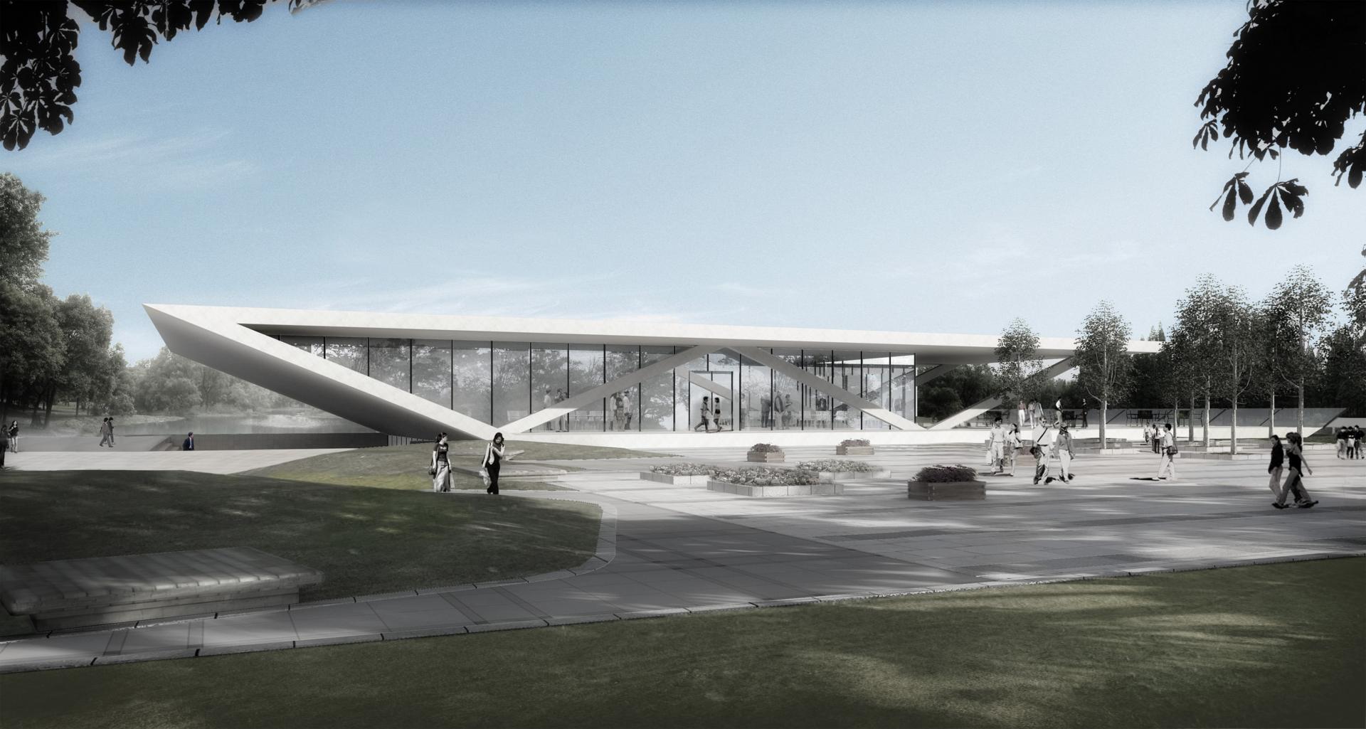 The basement section with its access and its open space is formed like a trapezoid-shaped trench in the landscape. The “Pavilion” with gastronomy and shop area spans this trench like an autonomous building structure. With its large terraces and transparent façades, the building opens to the south, overlooking the park. The wide sweeping roof protects the interior of the building from solar heat gain and provides shade for the terrace.