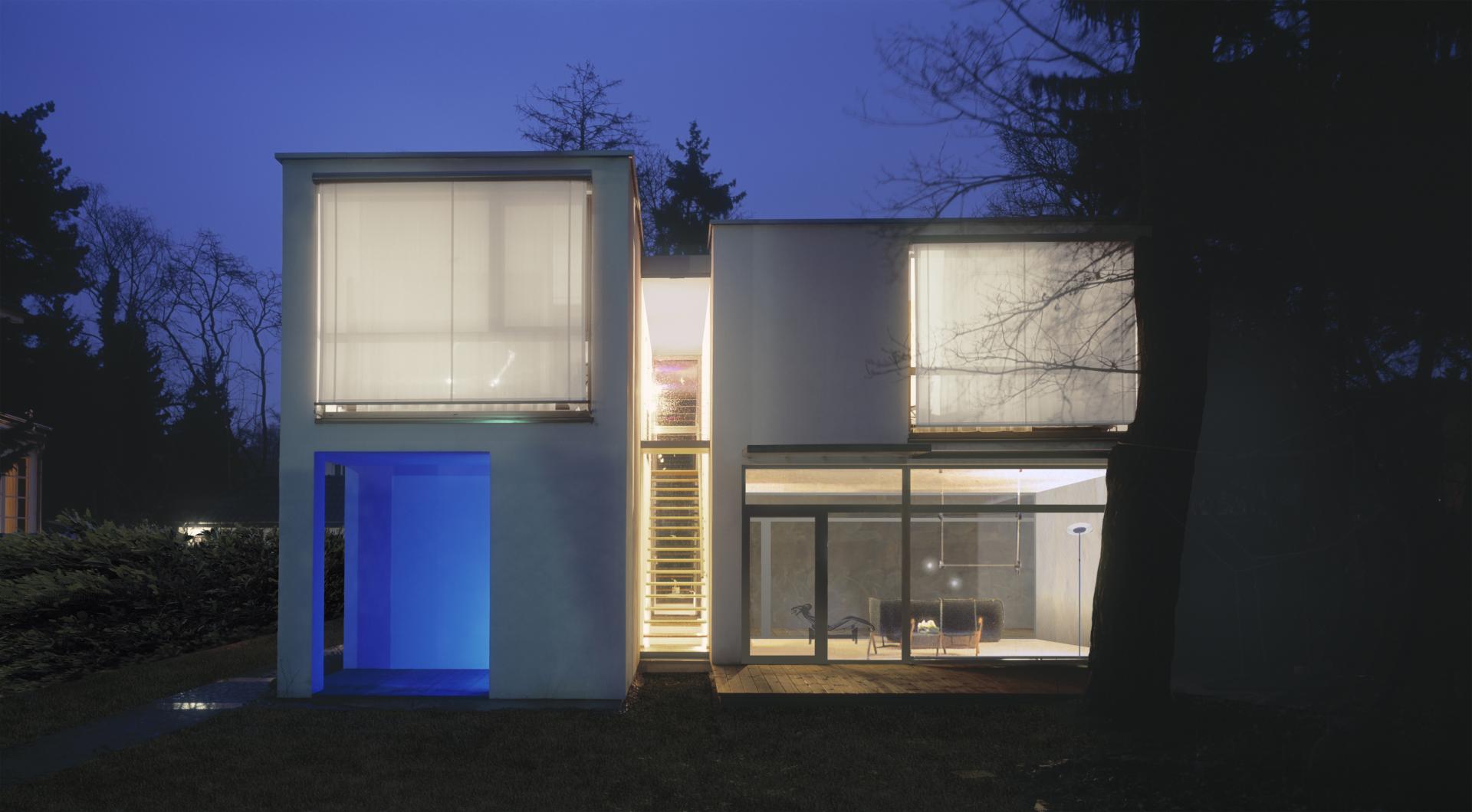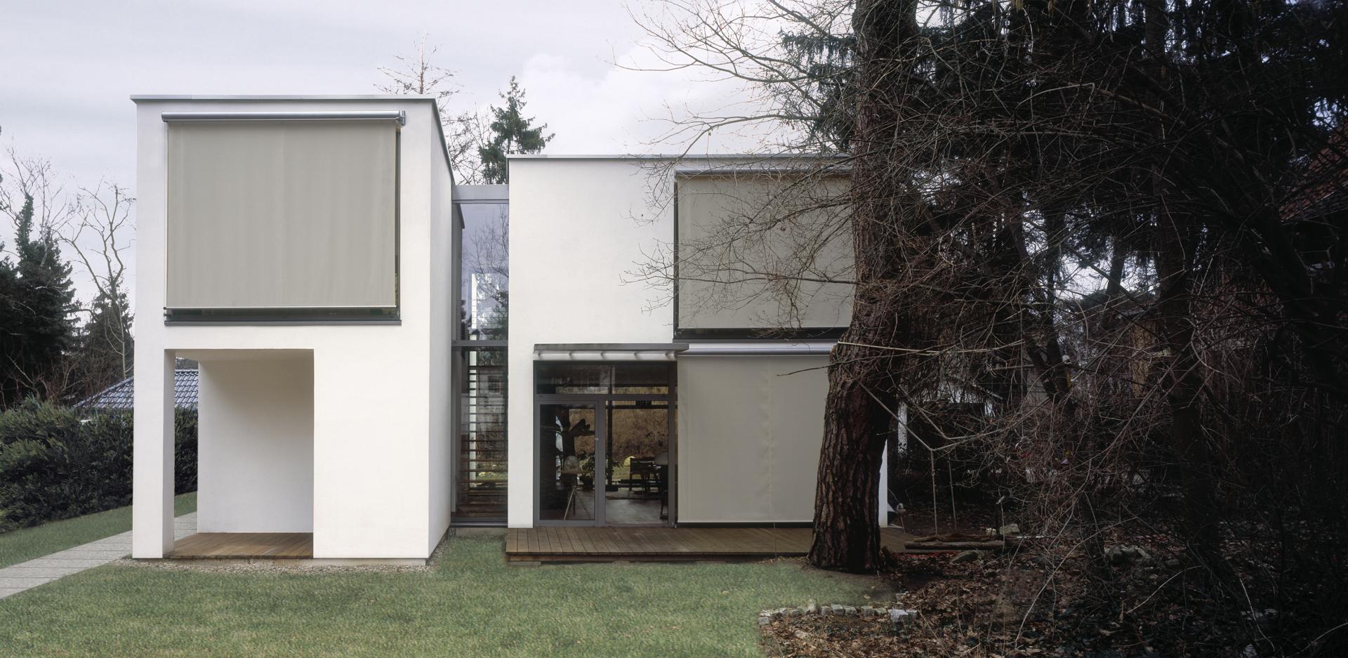 This house for the family of a senior surgeon is benefited from the planning precedent set by two Bauhaus villas in the same street; the architecturally desired clarity of the building's volumes and its details meshed harmoniously with the intellectual and sensual world of the clients. Thus a house of unusual elegance, peacefulness and presence, and one which is well loved by its users, could be erected within a modest budget.